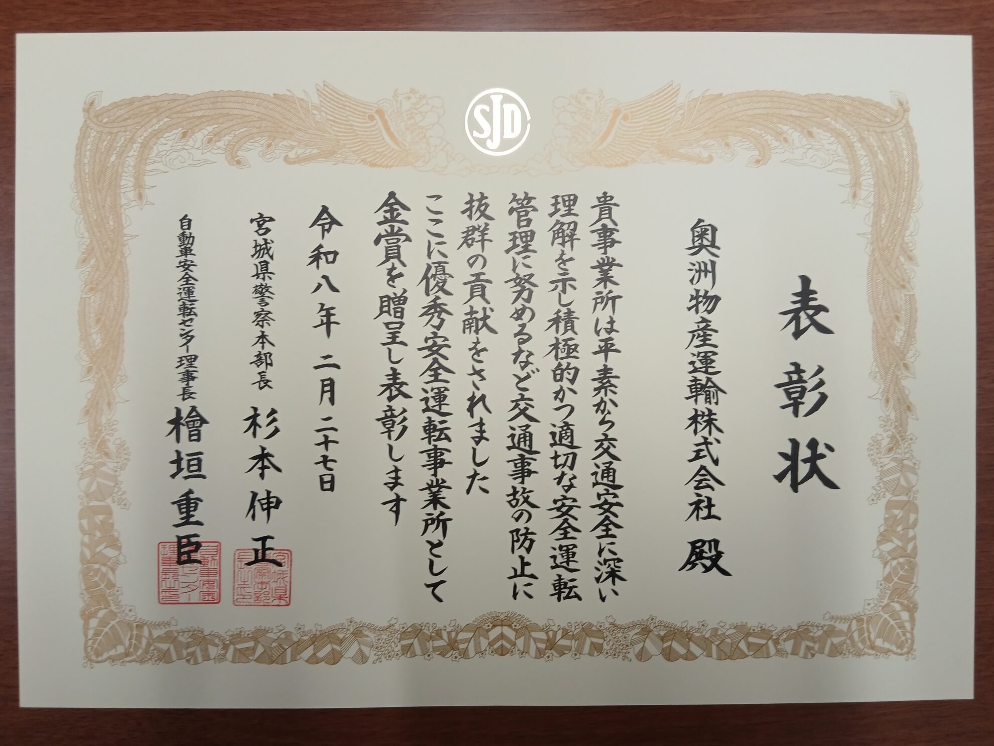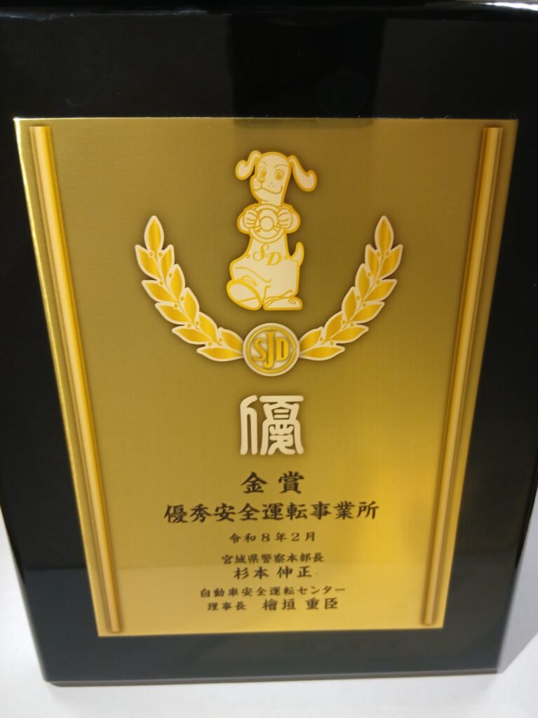 このたび、優秀安全運転事業所として表彰していただきました。